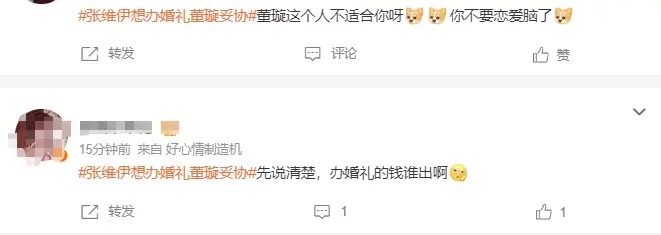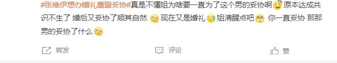 董璇有事是真的上呀,之后就瞒着(张维伊应该料定董璇会帮自己去联系)张维伊就辗转要到了张维伊所谓的好友的联系方式,并且亲自打了电话过去,放下面子一顿下来,对方还是不愿意来参加婚礼。